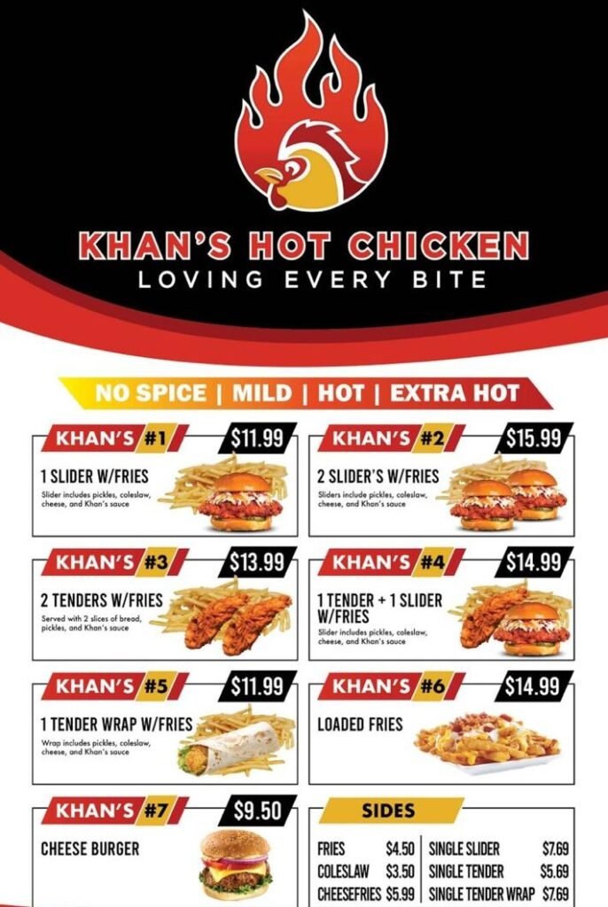 Khans Hot Chicken serves bold, crispy, and flavor-packed meals that keep you coming back for more. Known for its sizzling spice and crunchy perfection, it’s the go-to spot for fast, fresh, and unforgettable hot chicken.